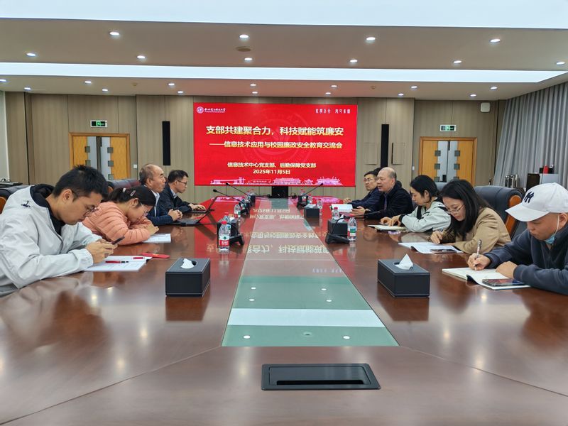 为深入学习贯彻党的二十届四中全会精神,全面落实中央八项规定精神,推动党建工作与业务工作深度融合,11月5日,信息技术中心党支部与后勤保障党支部联合举办了“信息技术应用与校园廉政安全教育交流会”。会议由后勤保障党支部书记、公管处副处长许梦倩主持。